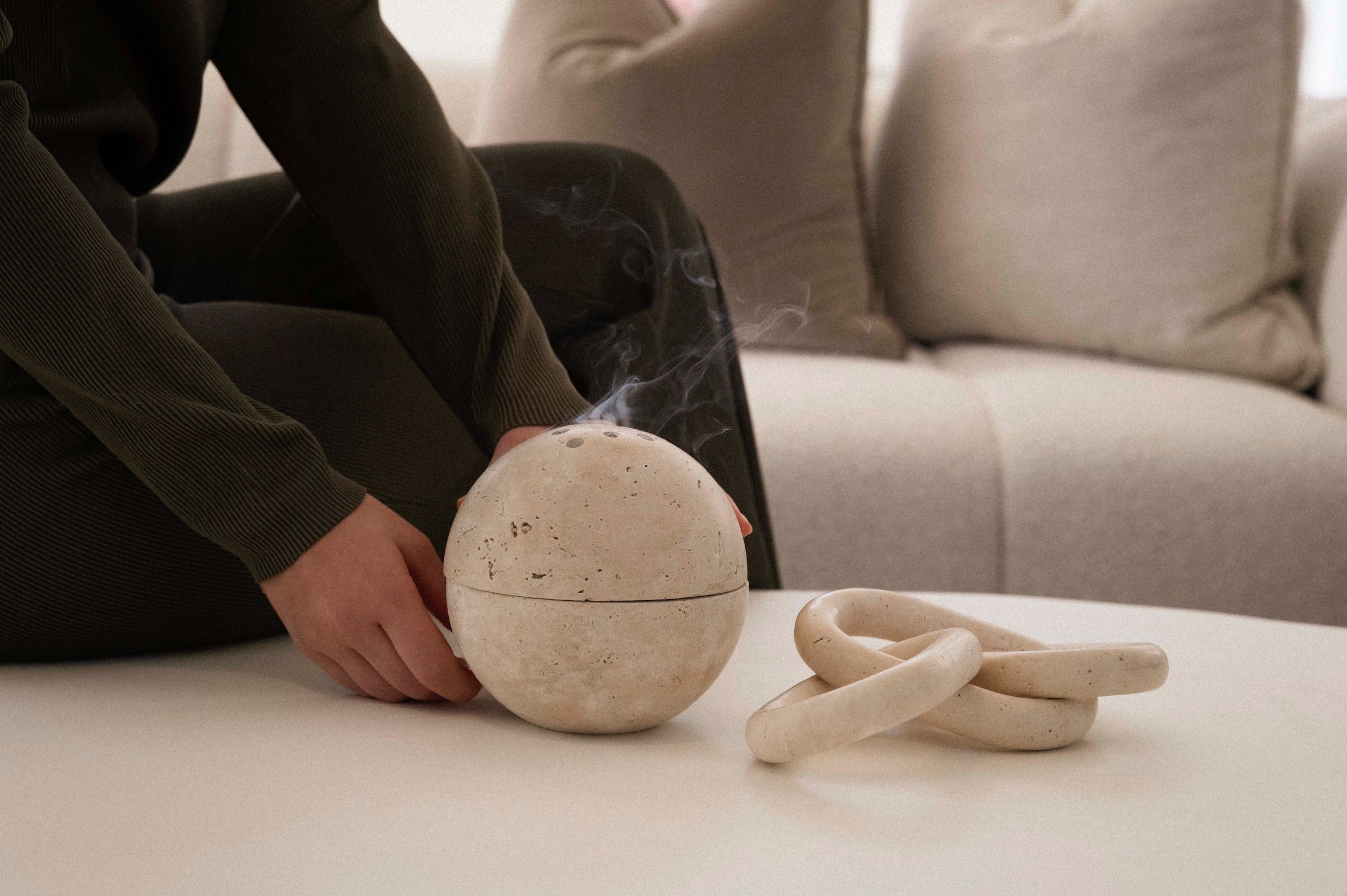 The Luna Sphere Incense Burner is perfect for those who appreciate functional art and minimalistic design. Its natural Travertine stone and sculptural versatility allow it to serve as both an incense burner and a decorative piece.