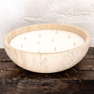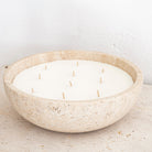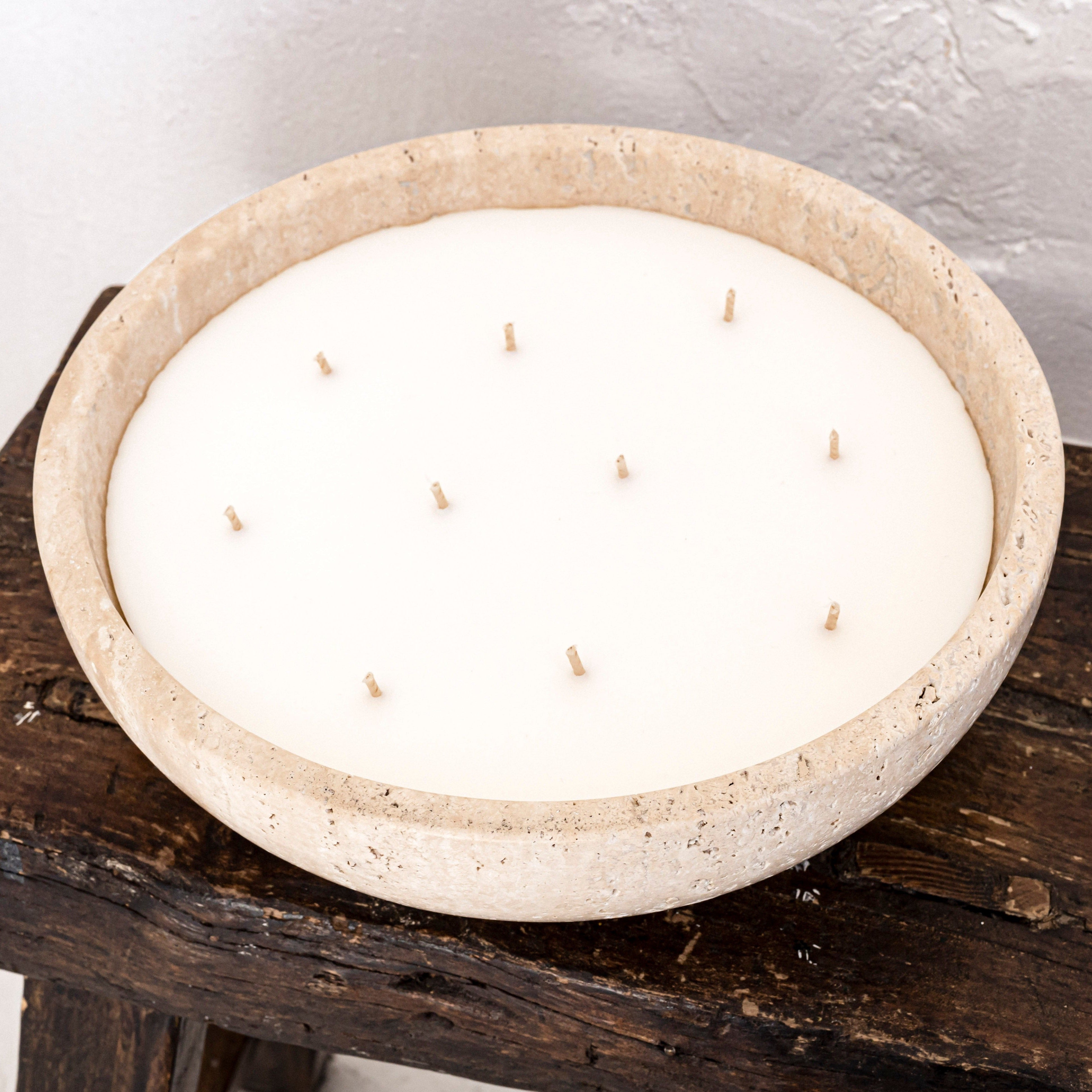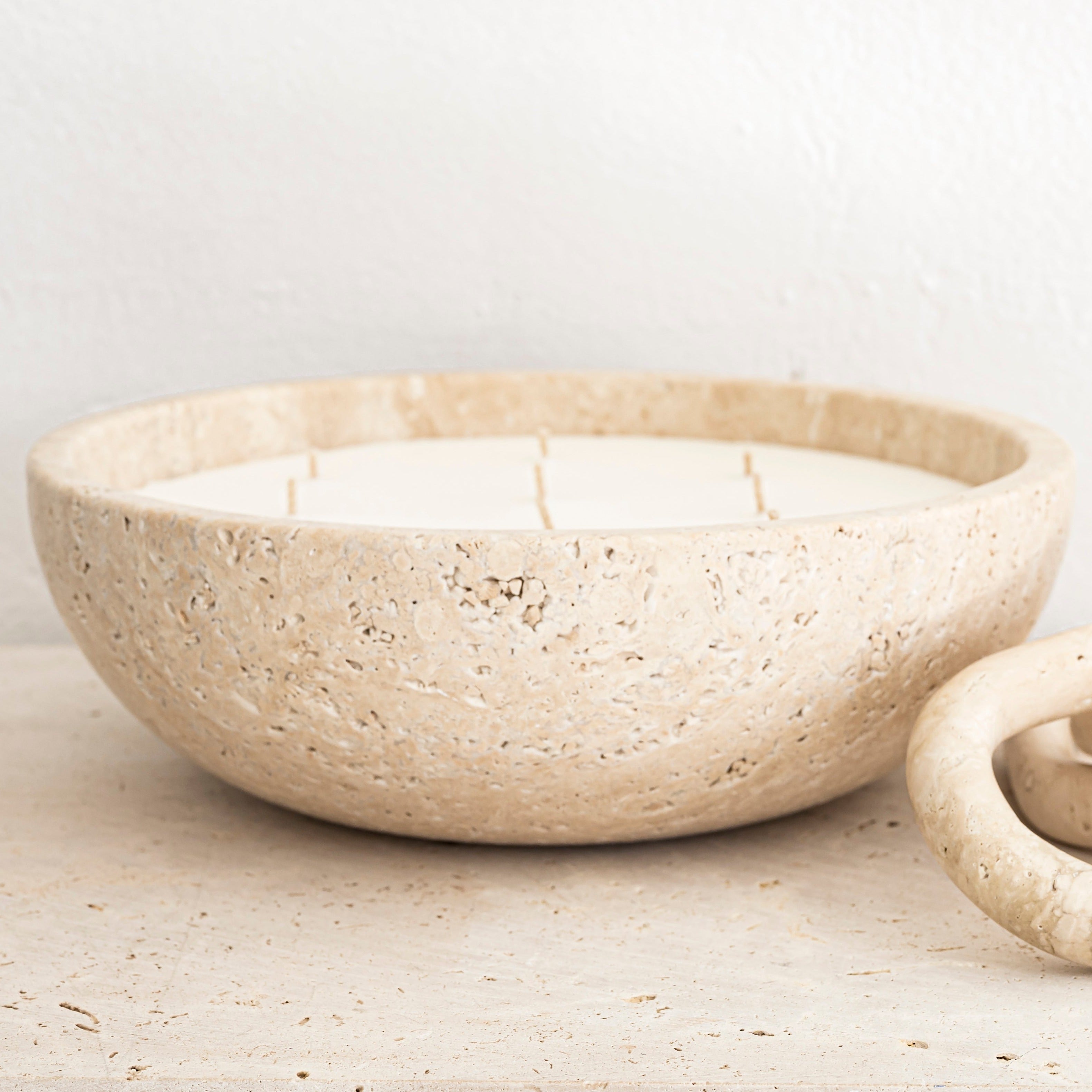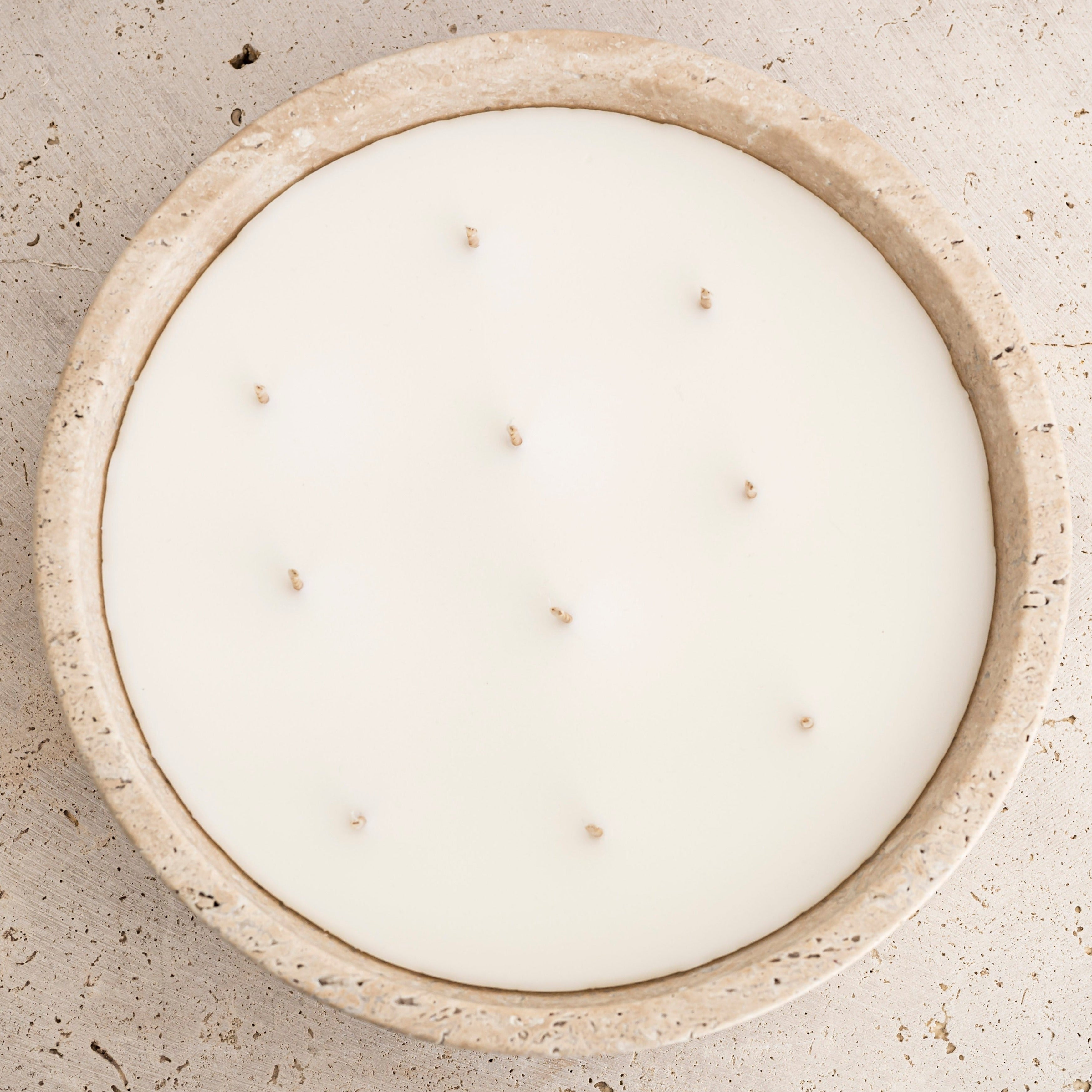 Luminous is made of natural travertine, a type of natural stone characterised by its warm, creamy colour with subtle variations and a distinct pattern. It is a popular choice for various interior design applications due to its elegant and earthy appearance. Haus of Aitch customised this gorgeous material into large, long-lasting candle.